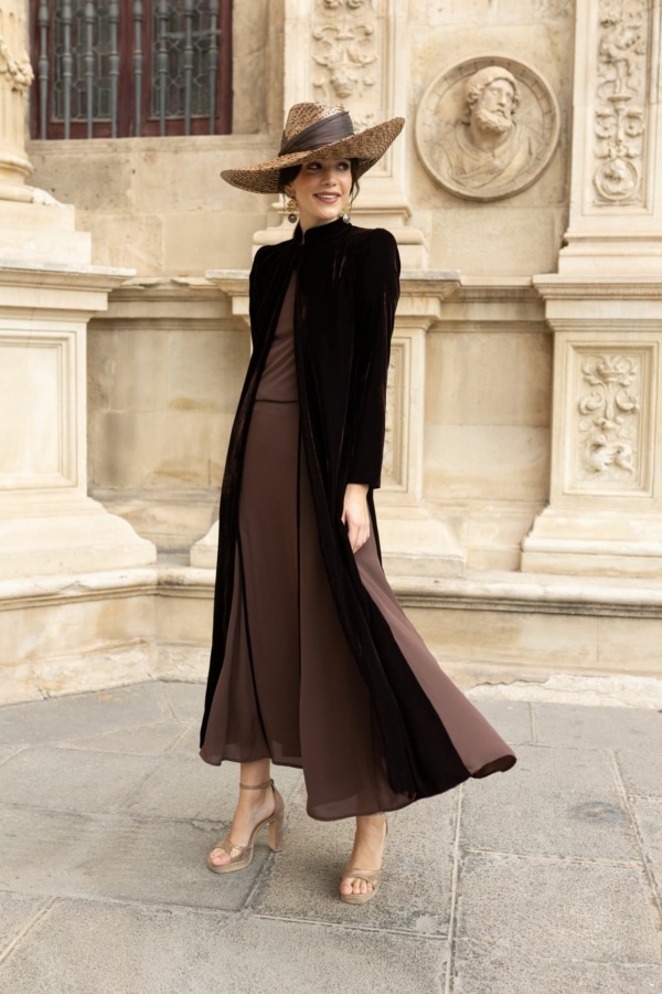 Abrigo largo de terciopelo con cuello mao, con broche central. Lleva como detalle un godette lateral en gasa al contraste. ¡Perfecto para cualquier evento de invierno!