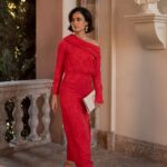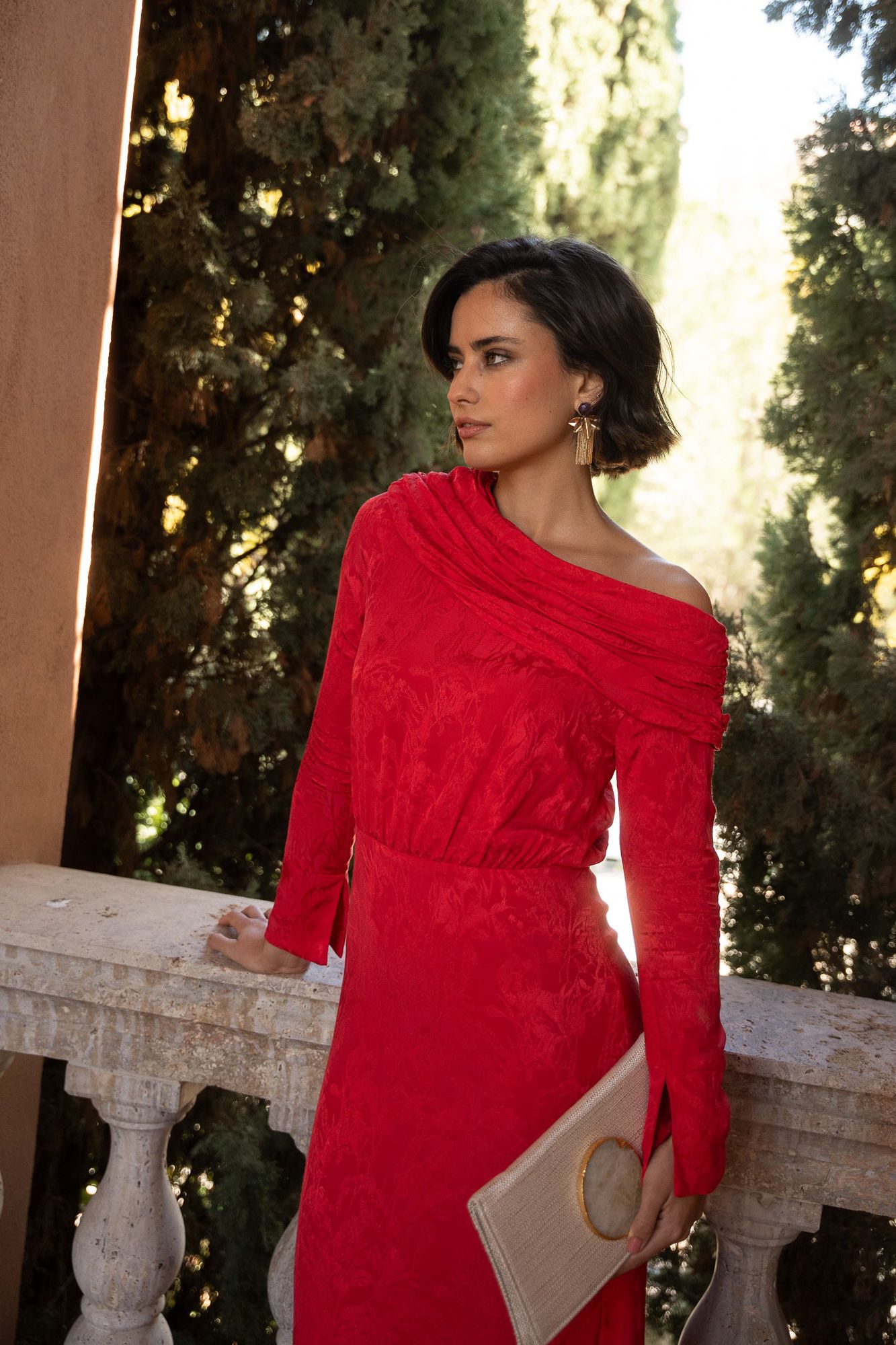 Vestido con hombro asimétrico, manga larga acampanada con raja lateral. Estampado en