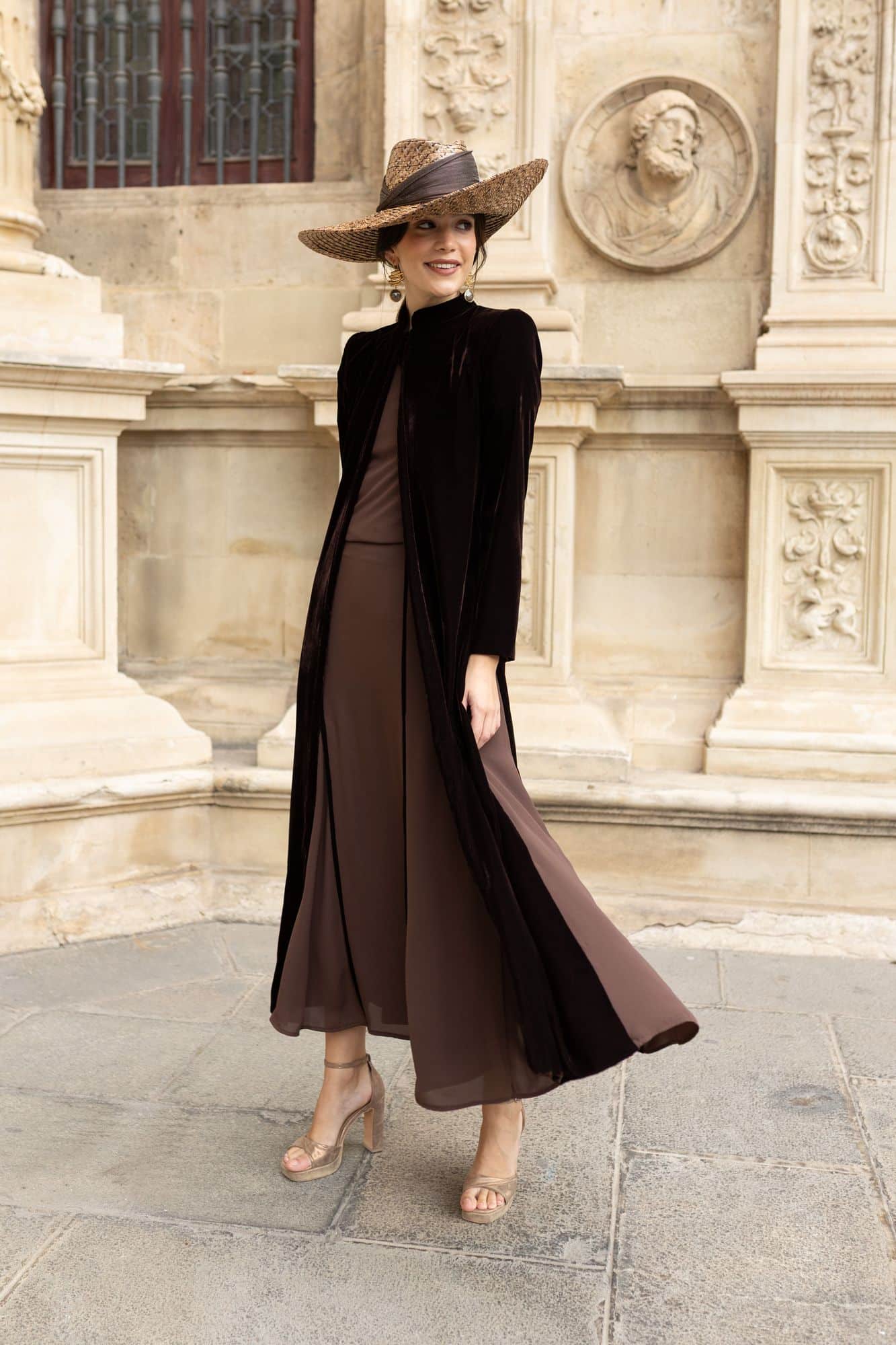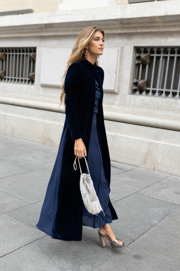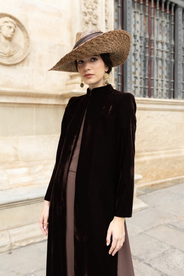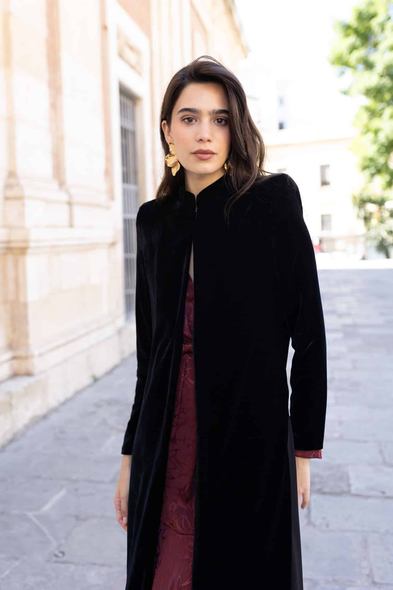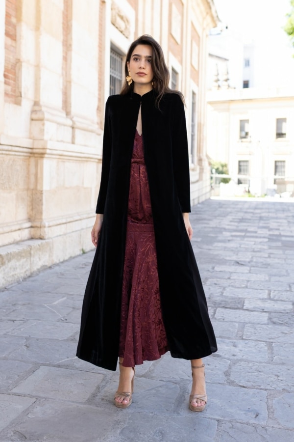 Abrigo largo de terciopelo con cuello mao, con broche central. Lleva como detalle un godette lateral en gasa al contraste. ¡Perfecto para cualquier evento de invierno!