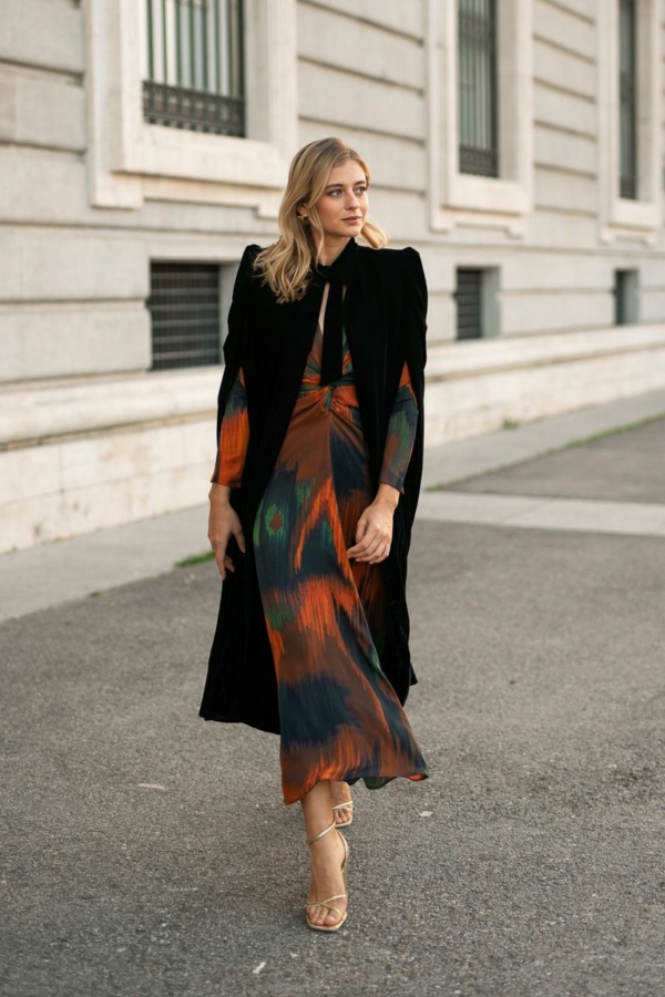 €150,00Abrigo largo de terciopelo con cuello mao, con broche central. Lleva como detalle un godette lateral en gasa al contraste. ¡Perfecto para cualquier evento de invierno!