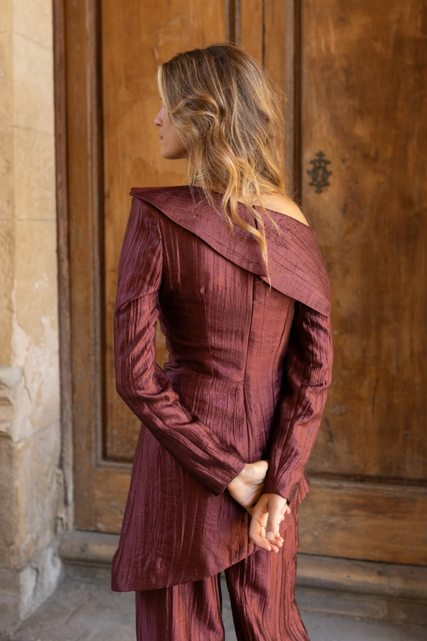 El top es asimétrico y ajustado, alargando así la silueta. Tiene una solapa amplia que cruza diagonalmente con el pecho, creando un efecto ideal en todo tipo de cuerpos.