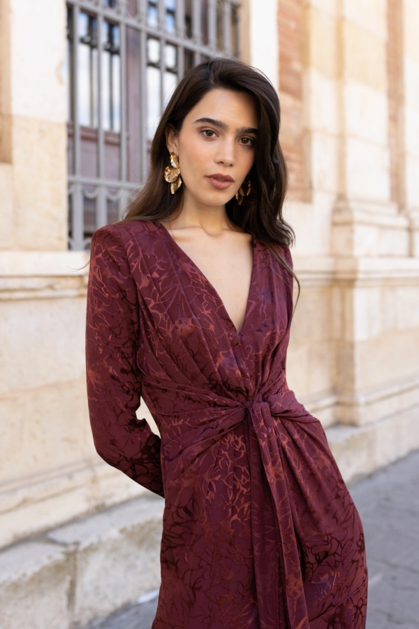Vestido en escote V, con cuerpo drapeado y nudo delantero. En un tejido espectacular que dice todo a la prenda, al tener un dibujo en brillo no pasa desapercibido.