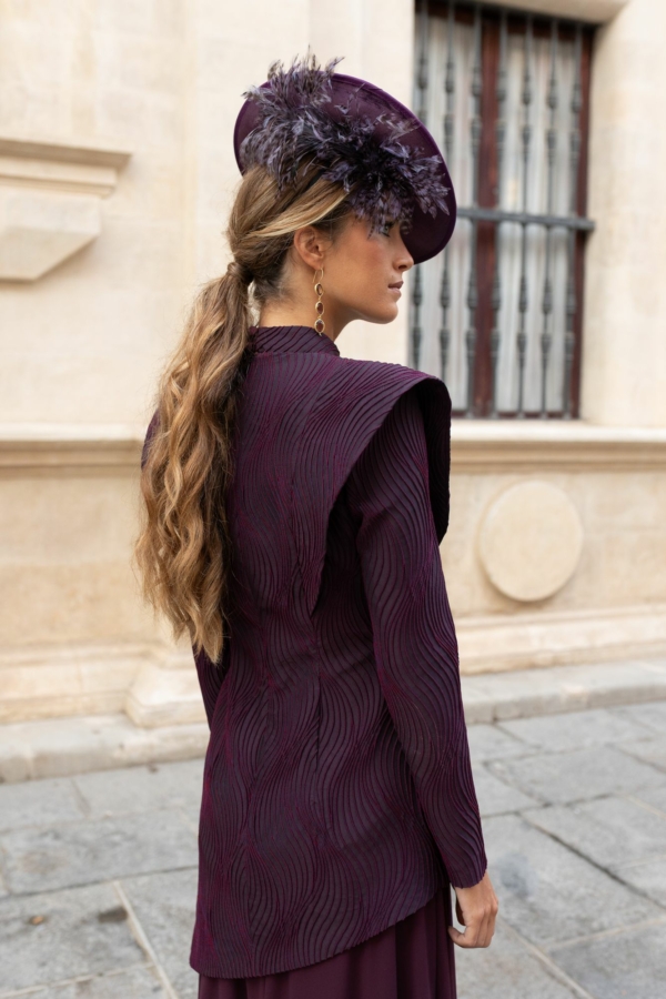 Cuerpo con tejido super especial creando ondas, solapas pronunciadas y manga larga recta.